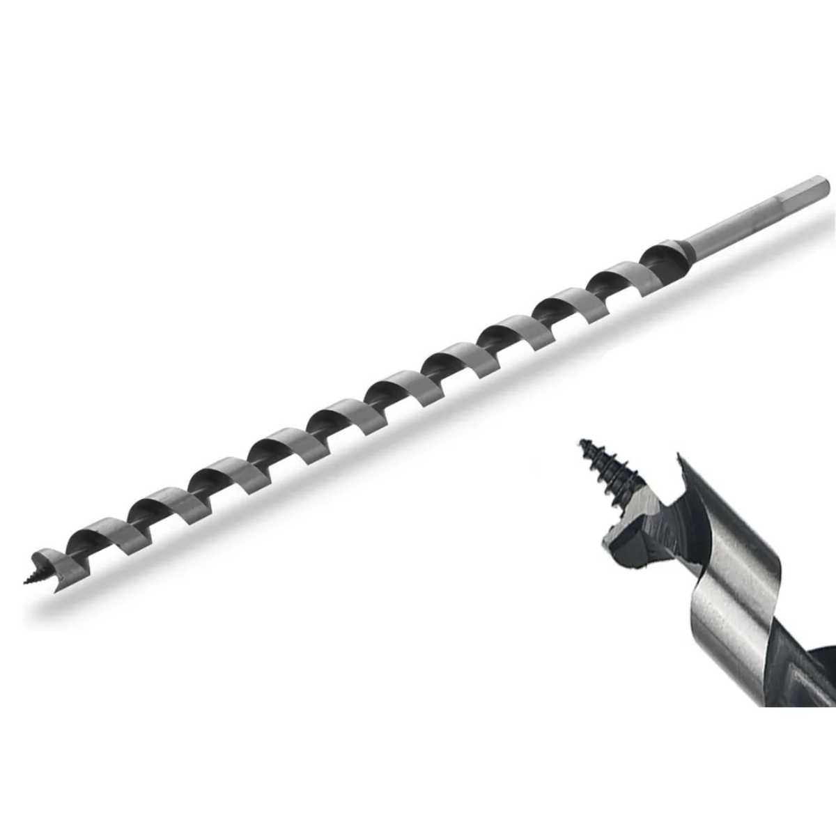 Broca Helicoidal, acero CV, vástago de inserción hexagonal, rectificada con precisión, color negro, pulido metálico, cabezal de perforación con punta de apriete automático para taladros eficientes con poca fuerza aplicada, filo principal rectificado con precisión, cortador previo, para perforaciones exactas en vigas de madera y trabajos en armaduras del tejado, de calidad industrial, adecuada para el empleo en la industria auxiliar de construcción por parte de carpinteros e instaladores de techos.